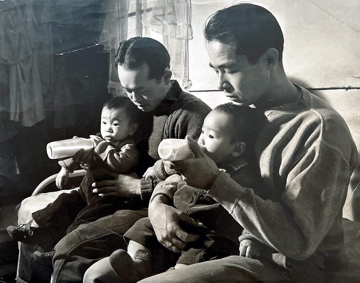 This is a picture taken by a Time/Life photographer. That’s my grandpa on the left holding my dad while imprisoned at the Heart Mountain incarceration camp in late 1942/early 1943. The government made sure this photo was never printed, lest anyone develop sympathies for the “enemy aliens” who had been rounded up and imprisoned without due process, losing everything they owned that wouldn’t fit inside a suitcase. And if you’re wondering, yes the entire family were American citizens. Not that it matters.